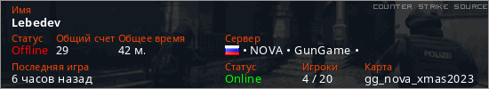 Играет на Counter Strike Source сервере. Страна: РоссияПервый раз замечен 21:34 02.12.2025