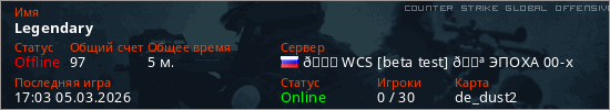 Играет на Counter Strike Global Offensive сервере. Страна: РоссияПервый раз замечен 16:46 05.03.2026