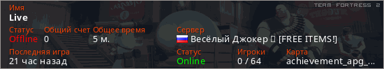 Играет на Team Fortress 2 сервере. Страна: РоссияПервый раз замечен 05:32 09.03.2026