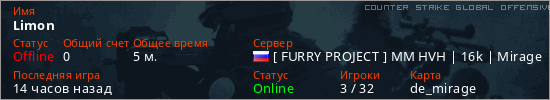 Играет на Counter Strike Global Offensive сервере. Страна: РоссияПервый раз замечен 19:45 22.04.2026