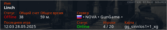 Играет на Counter Strike Source сервере. Страна: РоссияПервый раз замечен 22:01 22.05.2025