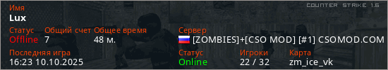 Играет на Counter Strike 1.6 сервере. Страна: РоссияПервый раз замечен 10:29 10.10.2025
