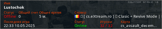 Играет на Counter Strike 1.6 сервере. Страна: РумынияПервый раз замечен 22:30 10.05.2025