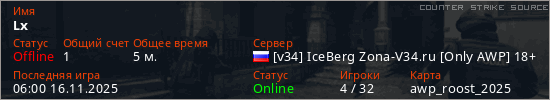 Играет на Counter Strike Source сервере. Страна: РоссияПервый раз замечен 05:33 16.11.2025
