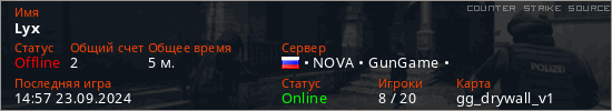 Играет на Counter Strike Source сервере. Страна: РоссияПервый раз замечен 14:55 23.09.2024