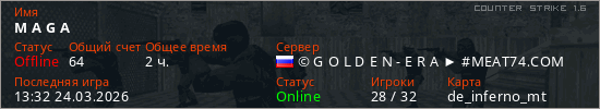 Играет на Counter Strike 1.6 сервере. Страна: РоссияПервый раз замечен 17:44 22.03.2026