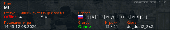 Играет на Counter Strike 1.6 сервере. Страна: РоссияПервый раз замечен 14:43 12.03.2026
