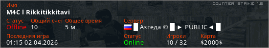 Играет на Counter Strike 1.6 сервере. Страна: РоссияПервый раз замечен 01:09 02.04.2026