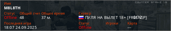 Играет на Counter Strike 1.6 сервере. Страна: РоссияПервый раз замечен 18:47 15.09.2025