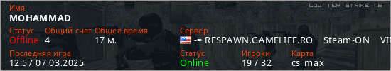 Играет на Counter Strike 1.6 сервере. Страна: СШАПервый раз замечен 00:08 04.03.2025