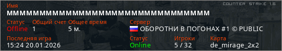 Играет на Counter Strike 1.6 сервере. Страна: РоссияПервый раз замечен 15:16 20.01.2026