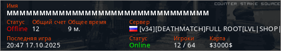 Играет на Counter Strike Source сервере. Страна: РоссияПервый раз замечен 20:35 17.10.2025