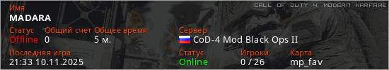 Играет на Call of Duty 4: Modern Warfare сервере. Страна: РоссияПервый раз замечен 21:27 10.11.2025