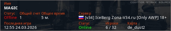 Играет на Counter Strike Source сервере. Страна: РоссияПервый раз замечен 12:52 24.03.2026