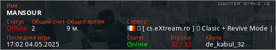 Играет на Counter Strike 1.6 сервере. Страна: РумынияПервый раз замечен 16:39 04.05.2025