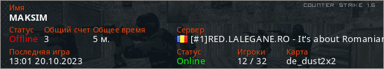 Играет на Counter Strike 1.6 сервере. Страна: РумынияПервый раз замечен 12:59 20.10.2023