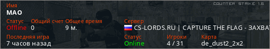 Играет на Counter Strike 1.6 сервере. Страна: РоссияПервый раз замечен 20:39 10.03.2026