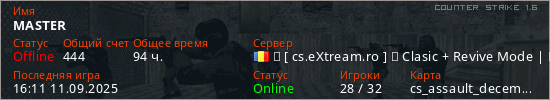 Играет на Counter Strike 1.6 сервере. Страна: РумынияПервый раз замечен 17:12 06.11.2024
