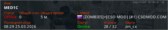 Играет на Counter Strike 1.6 сервере. Страна: РоссияПервый раз замечен 08:06 25.03.2026