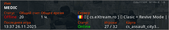 Играет на Counter Strike 1.6 сервере. Страна: РумынияПервый раз замечен 13:52 08.12.2024