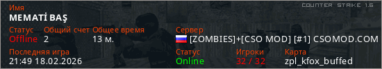 Играет на Counter Strike 1.6 сервере. Страна: РоссияПервый раз замечен 20:20 18.02.2026