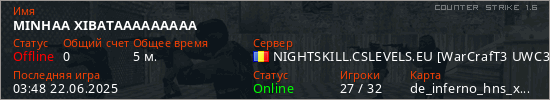 Играет на Counter Strike 1.6 сервере. Страна: РумынияПервый раз замечен 03:37 22.06.2025