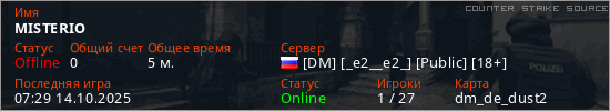 Играет на Counter Strike Source сервере. Страна: РоссияПервый раз замечен 07:22 14.10.2025