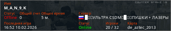 Играет на Counter Strike 1.6 сервере. Страна: РоссияПервый раз замечен 16:50 10.02.2026
