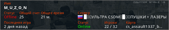 Играет на Counter Strike 1.6 сервере. Страна: РоссияПервый раз замечен 03:59 23.04.2026
