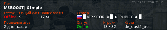Играет на Counter Strike 1.6 сервере. Страна: РоссияПервый раз замечен 09:47 21.01.2026
