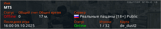 Играет на Counter Strike 1.6 сервере. Страна: РоссияПервый раз замечен 14:57 01.09.2025