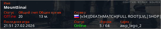 Играет на Counter Strike Source сервере. Страна: РоссияПервый раз замечен 22:43 25.02.2026