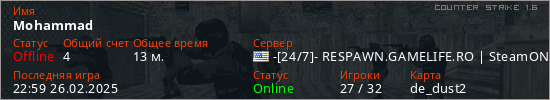 Играет на Counter Strike 1.6 сервере. Страна: СШАПервый раз замечен 12:26 02.02.2025