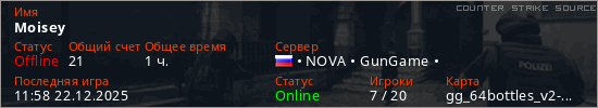 Играет на Counter Strike Source сервере. Страна: РоссияПервый раз замечен 19:31 22.01.2025