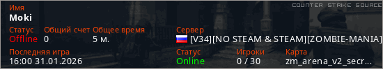 Играет на Counter Strike Source сервере. Страна: РоссияПервый раз замечен 15:58 31.01.2026