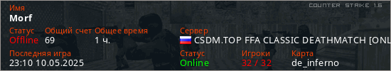 Играет на Counter Strike 1.6 сервере. Страна: РоссияПервый раз замечен 17:28 24.08.2023