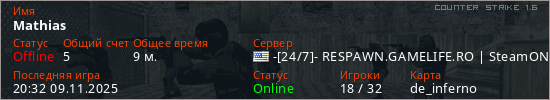 Играет на Counter Strike 1.6 сервере. Страна: СШАПервый раз замечен 16:23 04.05.2025