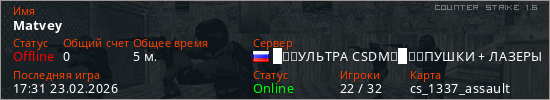 Играет на Counter Strike 1.6 сервере. Страна: РоссияПервый раз замечен 17:29 23.02.2026