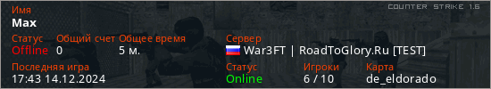 Играет на Counter Strike 1.6 сервере. Страна: РоссияПервый раз замечен 17:37 14.12.2024