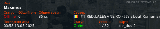 Играет на Counter Strike 1.6 сервере. Страна: РумынияПервый раз замечен 04:28 25.03.2023