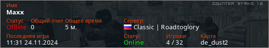Играет на Counter Strike 1.6 сервере. Страна: РоссияПервый раз замечен 11:29 24.11.2024