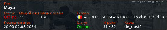 Играет на Counter Strike 1.6 сервере. Страна: РумынияПервый раз замечен 20:03 12.05.2023