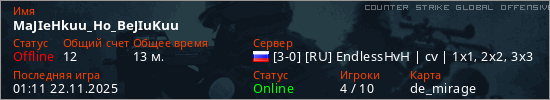 Играет на Counter Strike Global Offensive сервере. Страна: РоссияПервый раз замечен 18:02 21.11.2025