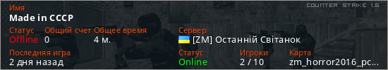 Играет на Counter Strike 1.6 сервере. Страна: УкраинаПервый раз замечен 20:44 21.03.2026