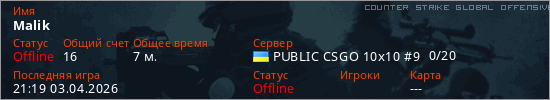 Играет на Counter Strike Global Offensive сервере. Страна: УкраинаПервый раз замечен 21:00 03.04.2026
