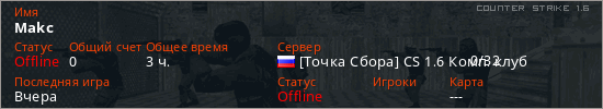 Играет на Counter Strike 1.6 сервере. Страна: РоссияПервый раз замечен 03:37 29.09.2025