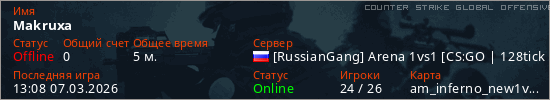 Играет на Counter Strike Global Offensive сервере. Страна: РоссияПервый раз замечен 13:06 07.03.2026
