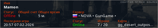 Играет на Counter Strike Source сервере. Страна: РоссияПервый раз замечен 20:48 07.02.2026