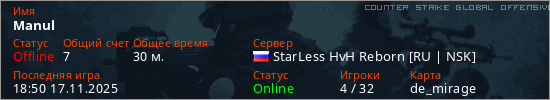 Играет на Counter Strike Global Offensive сервере. Страна: РоссияПервый раз замечен 22:00 16.11.2025