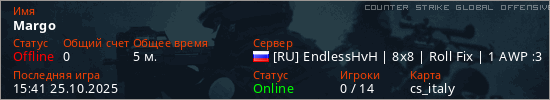 Играет на Counter Strike Global Offensive сервере. Страна: РоссияПервый раз замечен 15:36 25.10.2025